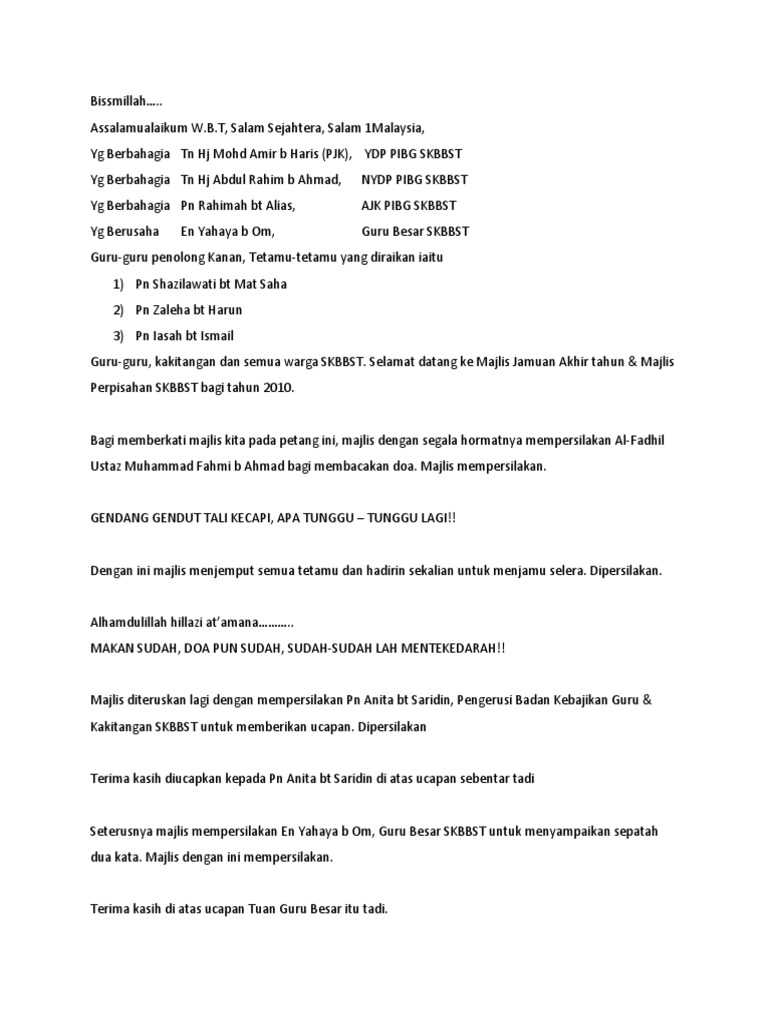 Teks bacaan doa sempena majlis perpisahan guru-guru dan jamuan akhir tahun march 9 2022 42 Kosa Kata Bahasa Arab Virus Korona March 8 2022 Tempat-Tempat Menarik di Terengganu March 7 2022. Contoh teks ucapan pengacara majlis sempena jamuan akhir tahun UCAPAN PENGACARA MAJLIS SEMPENA JAMUAN AKHIR TAHUN SMK DEMAK BARU. Koleksi cikgu harlina tuesday 13 november 2012 skrip pengacara jamuan akhir tahun 2012 tayangan video alu aluan bissmillahirrahmanirahim pengacara majlis ke pekan kuala membeli bingka sayang pesanan terlupa sudah.